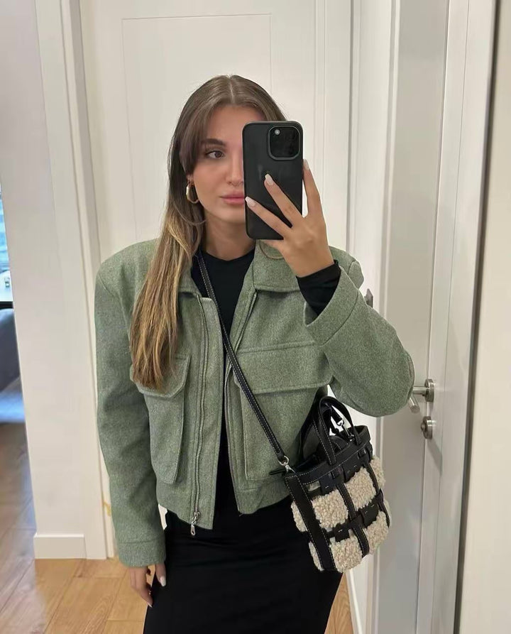Συνδυασμός: Φοριέται πάνω από μαύρο τοπ/φόρεμα, δημιουργώντας χρωματική αντίθεση. Ολοκληρώνεται με μικρή τσάντα με μοτίβο teddy/shearling και χρυσά κοσμήματα.