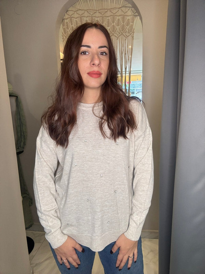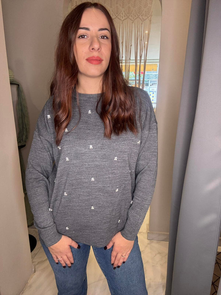 Λεπτομέρειες (Κυρίαρχο Στοιχείο): Το πουλόβερ διαθέτει μικρές διακοσμητικές πέρλες ή στρας (pearls/studs) διάσπαρτα σε όλο το μπροστινό μέρος του κορμού, και ενδεχομένως και στα μανίκια (αν και δεν φαίνεται ξεκάθαρα). Η διακόσμηση είναι διακριτική και ομοιόμορφα κατανεμημένη.