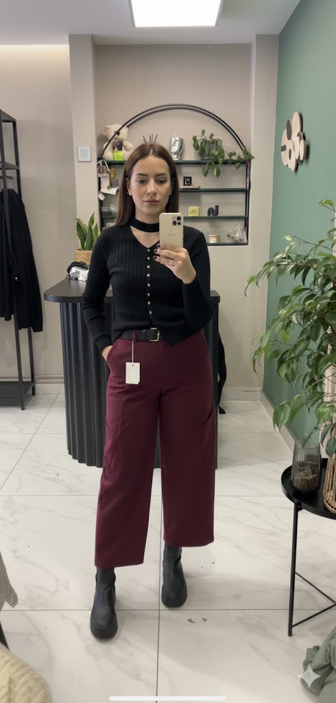 🍷 Περιγραφή Ρούχου: Πλατύ Παντελόνι Culotte σε Απόχρωση Μπορντό