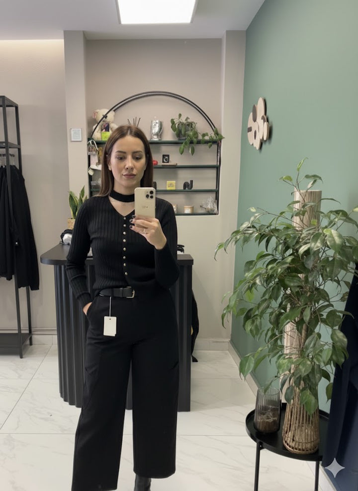 Συνδυασμός στην Εικόνα: Φοριέται με μαύρη εφαρμοστή πλεκτή μπλούζα με λαιμόκοψη $\text{V}$ και μαύρα μποτάκια με χοντρή σόλα.