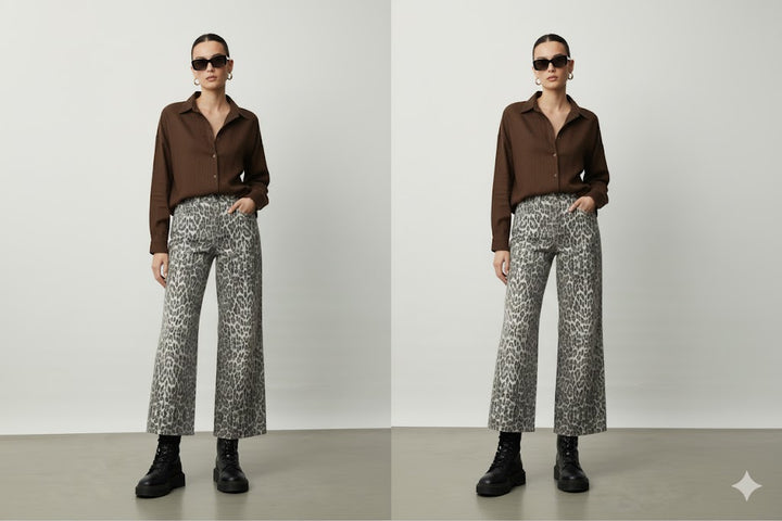 Διακόσμηση: Το κύριο χαρακτηριστικό είναι το animal print (λεοπάρ) σε μια αποχρωματισμένη/γκρι τόνωση (grey-scale/faded wash), δίνοντάς του ένα πιο μοντέρνο και λιγότερο έντονο αποτέλεσμα από το κλασικό καφέ.